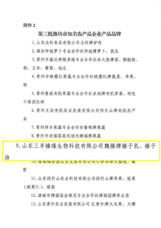 Congratulations to "Wei Zhen" hazelnut milk and hazelnut dietary oil being rated as the third batch of well-known agricultural product brands in Weifang City, and Shandong Sanyang Zhenyuan Biological Technology Co., Ltd. was rated as the first batch of leading enterprises in Weifang City's well-known agricultural product brands!