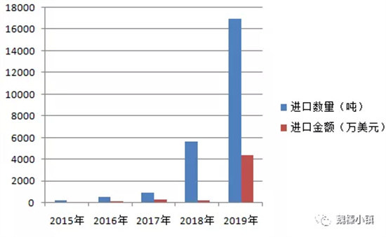 Statistics of imported quantity and amount of hazelnut with shell in China from 2015 to 2019