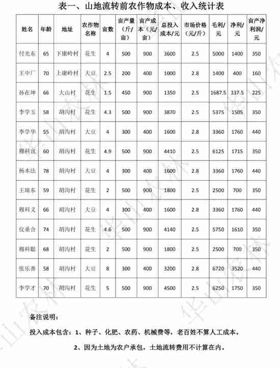 Shandong Huashan agricultural and Forestry Technology Co., Ltd. has transferred the mountainous areas of 13 villages in the southern mountainous areas of Huanghua town. Before the transfer, some of the mountains are cultivated by villagers themselves. Because of the poor soil and water conditions, peanuts and soybeans are mainly planted. According to the survey and comparison, the following table 1 and 2 are listed below: